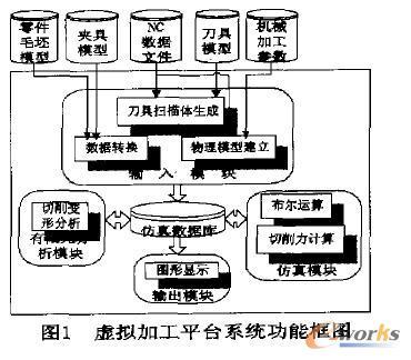 虛擬切削加工是指在數(shù)控機(jī)床上進(jìn)行的切削加工過程在虛擬環(huán)境下的映射。采用虛擬加工環(huán)境可以為一些零件的加工提供一個試切環(huán)境。圖1所示為虛擬加工平臺系統(tǒng)功能框圖。該系統(tǒng)的硬件環(huán)境是 PIII550。并利用現(xiàn)有的 CAD/CAM軟件所具有的強(qiáng)大的幾何建模及NC程序生成的功能,建立虛擬加工所需的幾何模犁以及豐成相應(yīng)的NC程序。所建立的幾何模型包括毛坯、零件、刀具和夾具等的幾何模型。所依據(jù)的建模平臺和分析平臺為 SolidWorks,CAMWorks,Cosmos/Works。該系統(tǒng)主要由四大核心模塊組成:輸入模塊,仿真模塊,分析模塊和輸出模塊。
