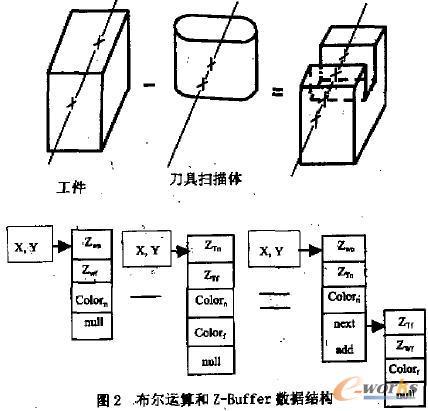 其運(yùn)算過程如圖2所示。在數(shù)據(jù)結(jié)構(gòu)中,對應(yīng)每一點(diǎn)(x,y)有一個近端Z值Zx,遠(yuǎn)端Z值Zy顏色值和指向該射線上下一個單元的指針。如圖所示,和工件的數(shù)據(jù)結(jié)構(gòu)的不同之處在于刀具的數(shù)據(jù)結(jié)構(gòu)中增加了遠(yuǎn)端的顏色值,這樣可以方便布爾運(yùn)算。圖中所示工拌開始時是毛坯,因此,沿射線方向只有一段,故指針為 null。同理,刀具的指針也為 null。當(dāng)?shù)毒咔邢鞴ぜr,如圖所示,兩個實(shí)體的布爾運(yùn)算在采用Z-Buffer的數(shù)據(jù)結(jié)構(gòu)后就簡化為視線方向的一維求差運(yùn)算。對應(yīng)像素(x,y)的射線。這時沿視線有四個交點(diǎn),由于工件被刀具掃描體分成兩部分,視線被裁剪為兩段。因此,對應(yīng)該像素點(diǎn) 少就有兩個單元。所進(jìn)行的布爾運(yùn)算只需對原來工件的數(shù)據(jù)結(jié)構(gòu)進(jìn)行 改,工件 單元遠(yuǎn)端Z值被刀具的近端Z值替換、指針不再等于零而是指向新產(chǎn)生的單元,而新單元的近端Z值為刀具的遠(yuǎn)端Z值。遠(yuǎn)端Z值是原工件單元的遠(yuǎn)端Z值。顏色等于刀具的遠(yuǎn)端顏色值,指針為零。系統(tǒng)對所有的像素不斷重復(fù)進(jìn)行著這樣的一維運(yùn)算。該種算法的分辨率取決于緩沖器的容量。