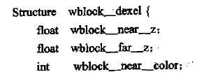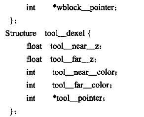 數(shù)據(jù)模型可以用光線投射法求得。因?yàn)楫?dāng)物體以邊界表示描述時,光線投射方法通常用來實(shí)現(xiàn)構(gòu)造實(shí)體幾何操作,令投影平面與顯示平面一致,從每一個像素位置發(fā)射一根射線穿過物體,然后沿每根射線路徑定出表面相交部分,保存深度值。工件和刀具的數(shù)據(jù)結(jié)構(gòu)為: